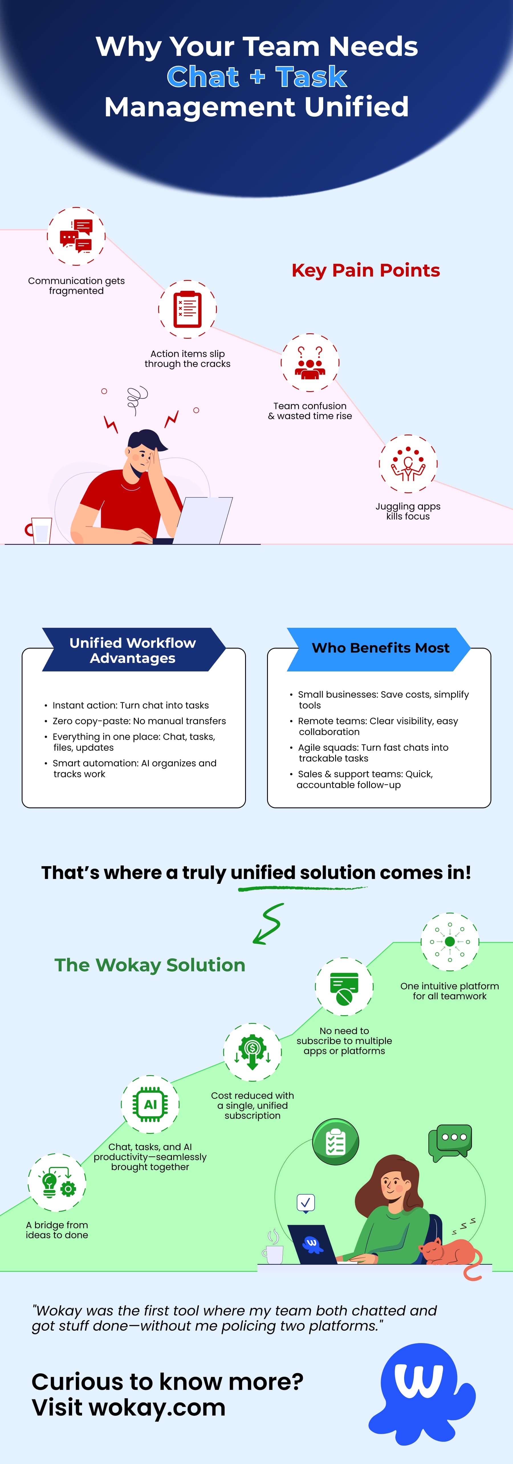 The future of productivity isn’t bouncing between a chat tool and a task app. It’s the fusion of communication and execution, powered by AI. Wokay delivers exactly that today — a unified solution to cut clutter, accelerate decisions, and ensure accountability.